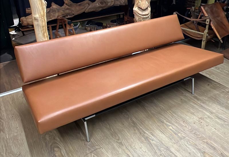 Bettsofas müssen im Verlaufe ihres Lebens so einiges aushalten. Und so verwundert es kaum, dass Polster und Bezüge irgendwann auch deutliche Zeichen der Zeit tragen. Aber muss das immer gleich das Ende für liebgewonnene und oft auch teure Stücke sein? Nein, wie dieser Fall hier zeigt. Denn nachdem wir es mit äusserst strapazierfähigem Leder neu bezogen haben, kann man sich getrost wieder neu in das gute Stück verlieben und sich die nächsten 15 Jahre daran erfreuen!