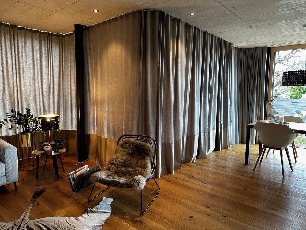 Trotz wunderbarer Aussicht auf die ganze Alpenkette… Vorhänge bringen Gemütlichkeit, verbessern die Raumakustik, verdecken die schwarzen Scheiben bei Dunkelheit und machen die Möblierung vollständig. Passend zu den schwarzen Armaturen in der Küche haben wir schwarze Innenlaufstangen eingesetzt. In der Küche und in den Nassräumen wurden Wabenplisséen installiert. Ein gelungenes Resultat mit rundum zufriedenen Kunden.