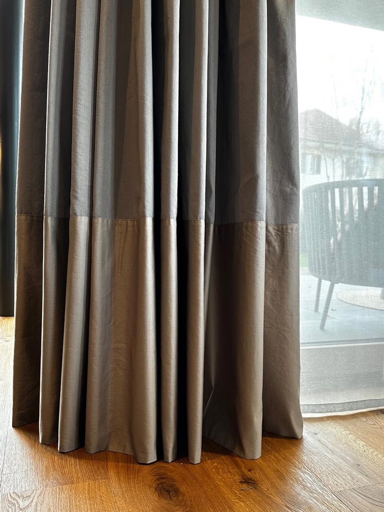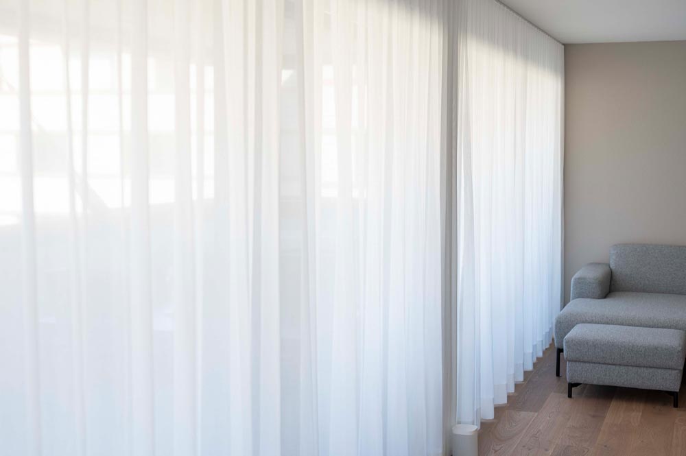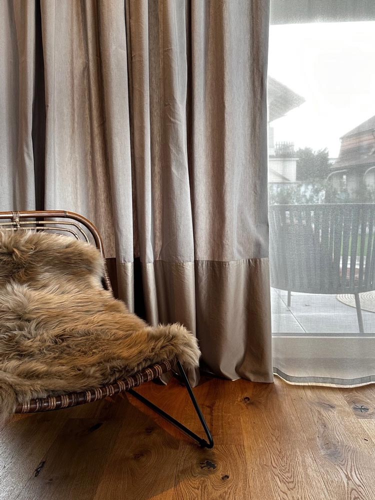 Pulfer's wünschten einen schlichten, halbtransparenten Vorhang. Dies haben wir mit einem 3-teiligen, flach konfektionierten Leinenvorhang gelöst.