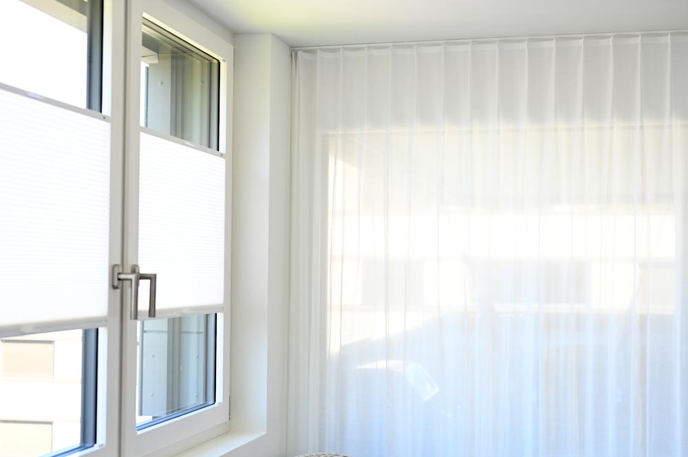 Bei der Neubauwohnung im Parterre war der Sichtschutz von aussen ein wichtiger Faktor. Trotzdem sollte nach gegen aussen eine gute Sicht und ausreichende Transparenz vorhanden sein. gegen aussen, In der ganze Wohnung durften wir Vorhangschienen und Vorhänge montieren. Im Bad kamen Duette-Plissée-Anlagen zum Einsatz. Zusätzlich wurden durch uns hoch funktionale Bilderschienen installiert.